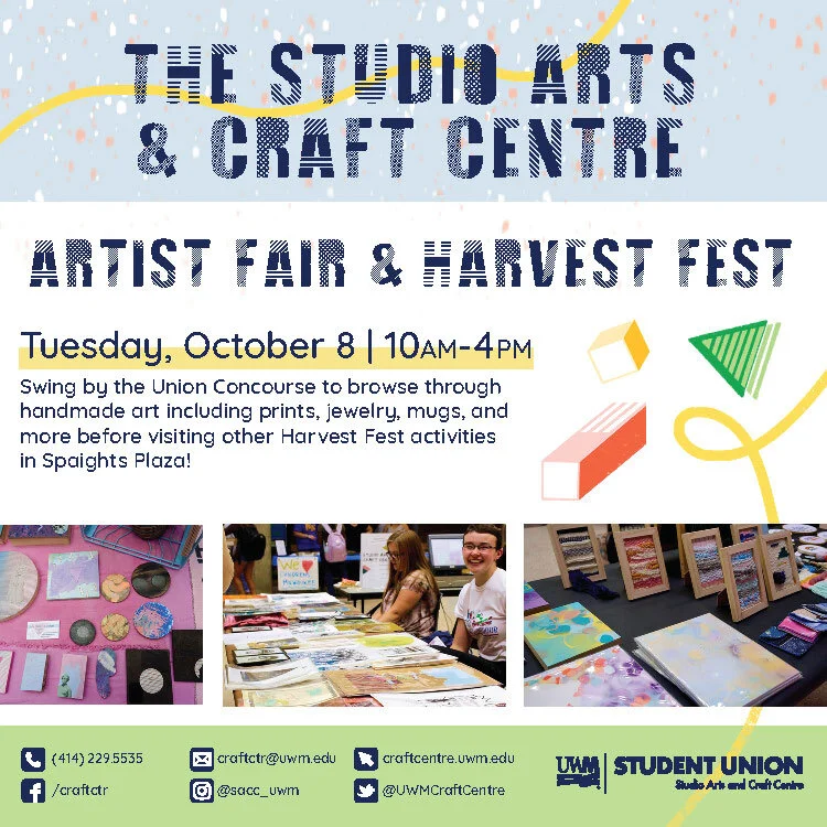 The UWM Union Studio Arts and Craft Centre put in a design order for a Fall 2019 event calendar. I broadened the new brand identity through illustrations to guide the reader through the booklet. The copy included many events on the calendar and the size of the booklet was a restraint. I developed a solution by creating a key read through corresponding symbols based on event type. The key symbols are further color coordinated by month, since many of the events were reoccurring. Since the new SACC branding includes a lot of shapes, this solution was the most successful.