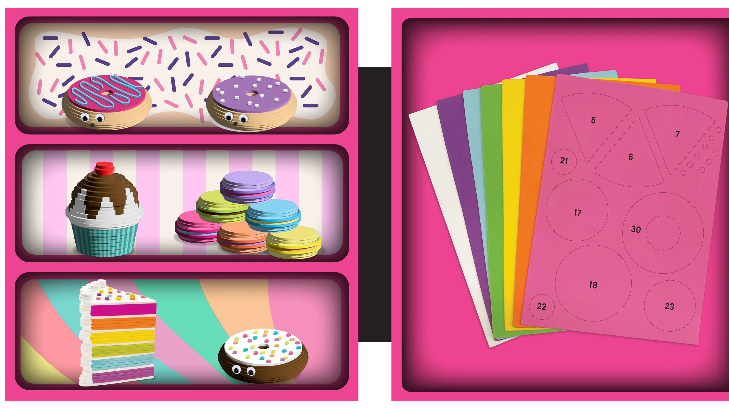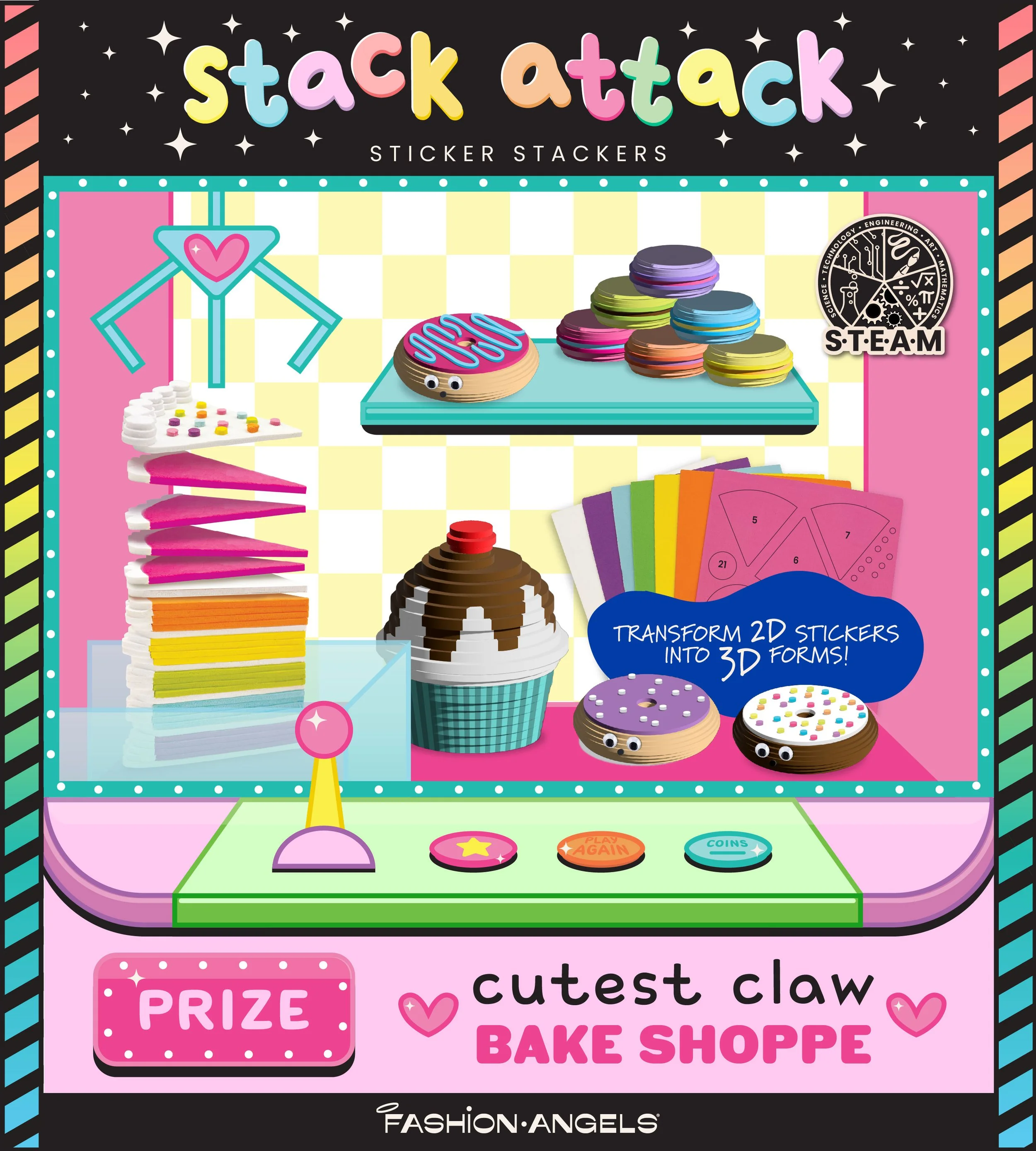 Peel, stick, stack, and play! These foam food toys are fun to build and they play continues long after you stick them together. This kit comes with numbered adhesive foam pieces, restaurant-ready accessories, and branding stickers. I worked on Sticker Stackers as a branding, packaging, and component designer. The concept was existing and I brought it to life. Retailed at Hobby Lobby and Walgreens! Scroll to see additional packaging design variations exploring claw machine theme.